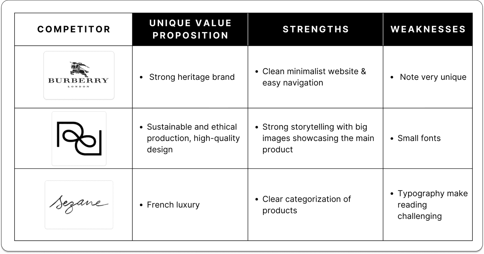 As we conducted a competitor analysis, we discovered that top luxury e-commerce websites all shared a common focus: clean, minimalist designs with intuitive navigation and clear product information. These sites prioritized features that enhanced the shopping experience, such as: