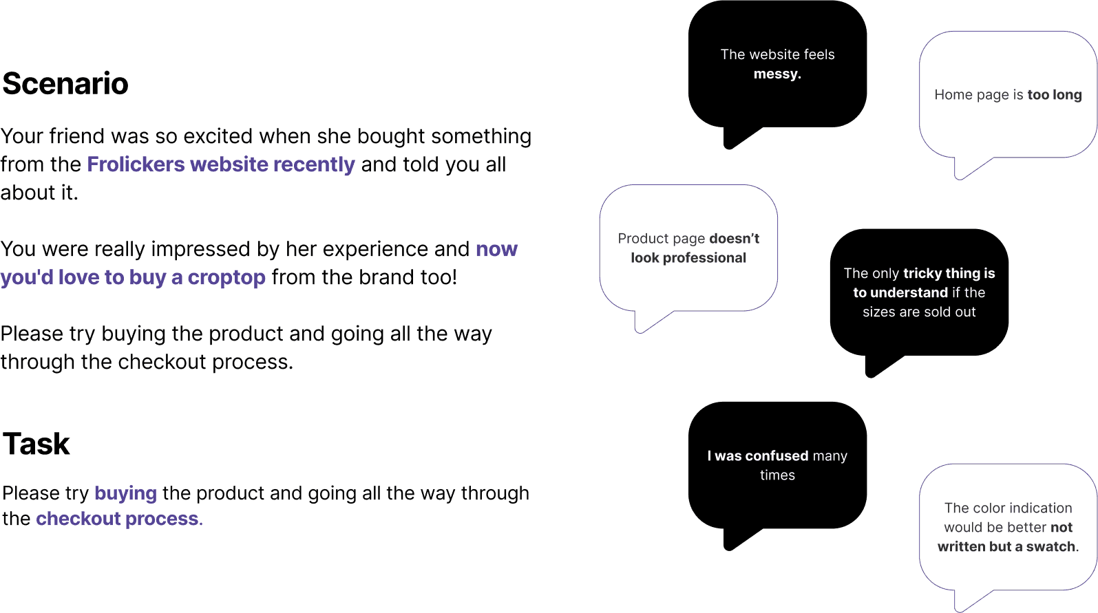 To understand the user experience, we asked participants about their first impressions and how they would describe the site. We explored whether product pages had enough information to make a purchase, how easy it was to select products, and if they encountered any issues with the features. therefore we conducted user interviews providing them with a scenario and giving them a task as it follows: